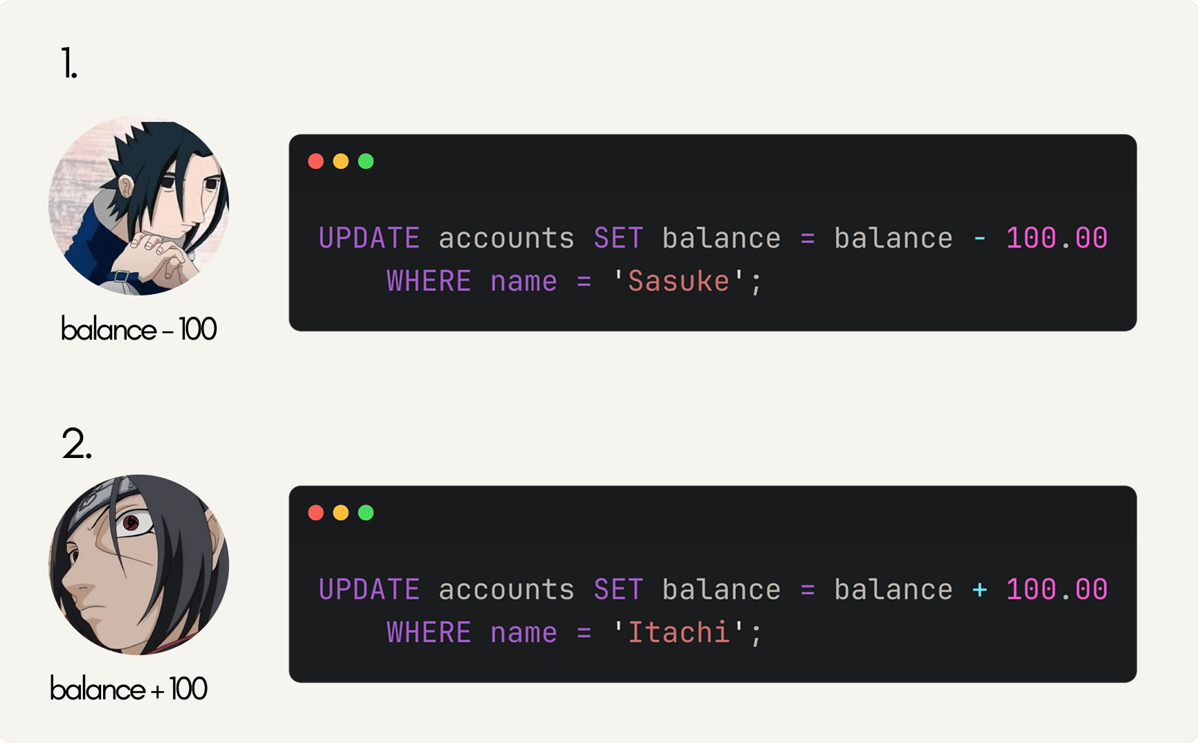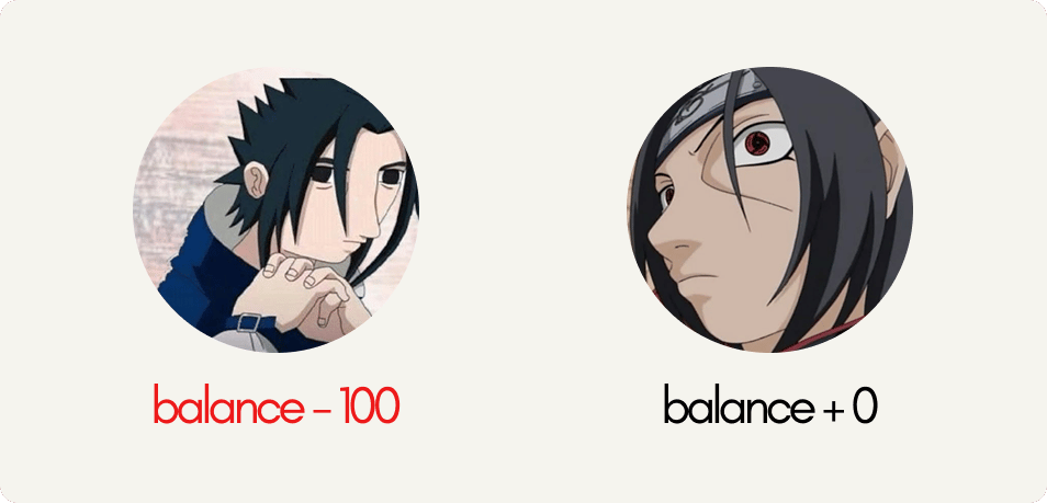 WHERE name = 'Sasuke';The balance in the transaction and in the database will be different: