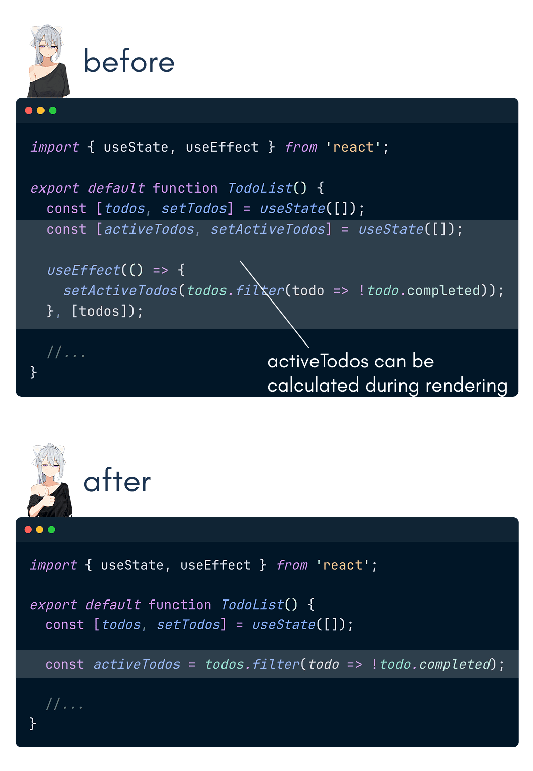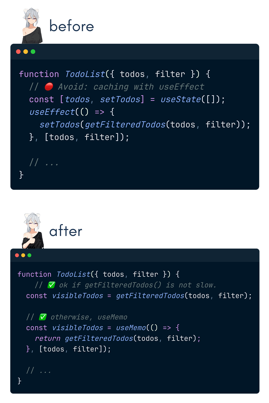 }, [item1, item2])This is a list of items to help React decide whether to rerun the useEffect.