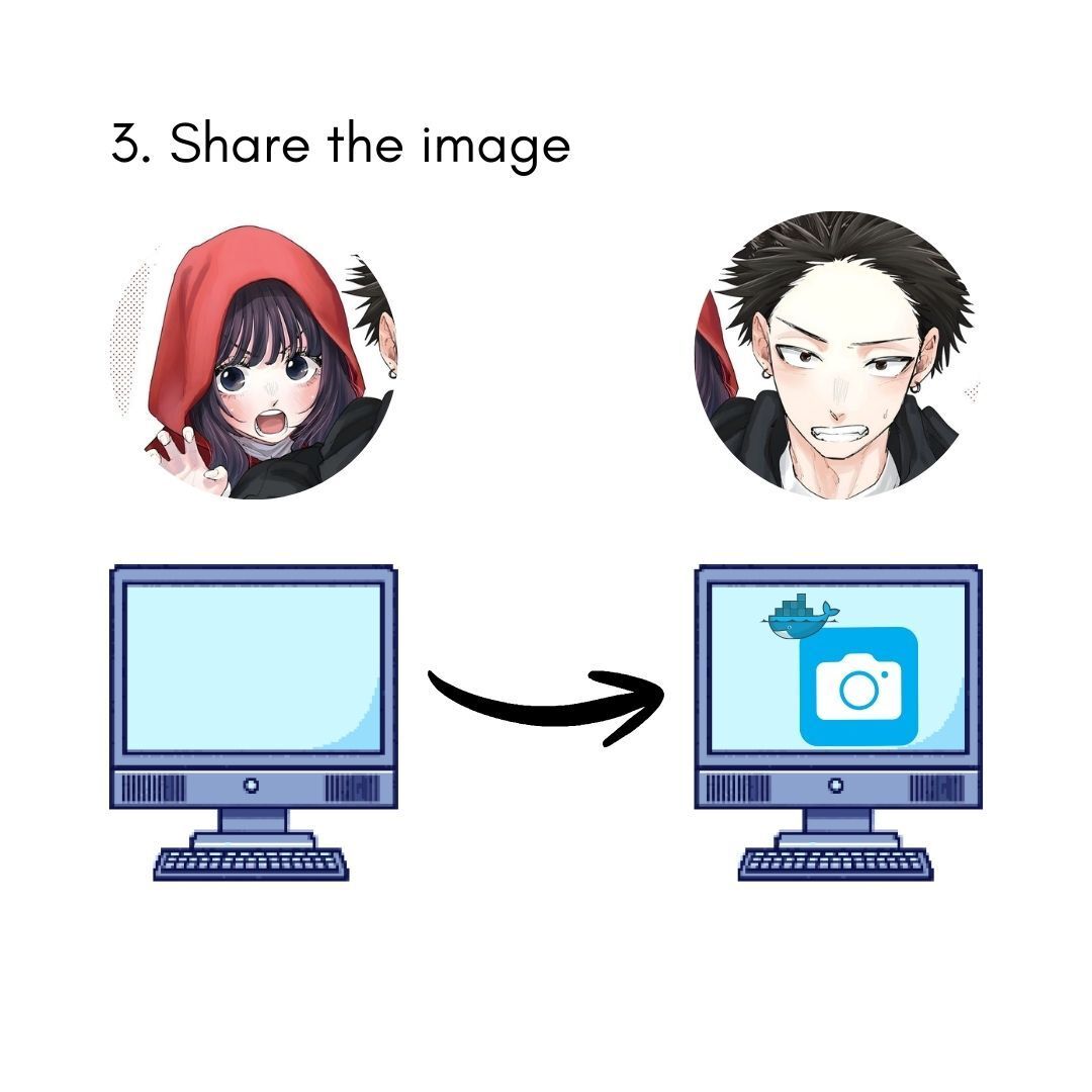 You could just send your friend the file & your code and tell him to build a container based on that.